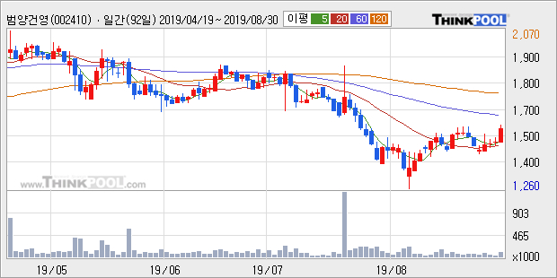범양건영의 2018년 매출액은 1556억으로 전년대비 13.7% 상승했고, 영업이익 또한 68억으로 전년대비 159.9% 상승했다. 이 회사의 매출액 증감률과 영업이익 증감률은 각각 코스피 상위 20%, 상위 8%에 해당된다.