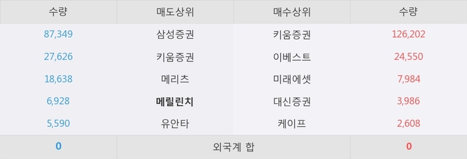 이 시각 주요 거래원은 미래에셋, 키움증권, 이베스트 등이 매수 상위 창구에 자리하고 있다. 한편, 매도 창구 상위에는 메릴린치가 눈에 띄고 있다.