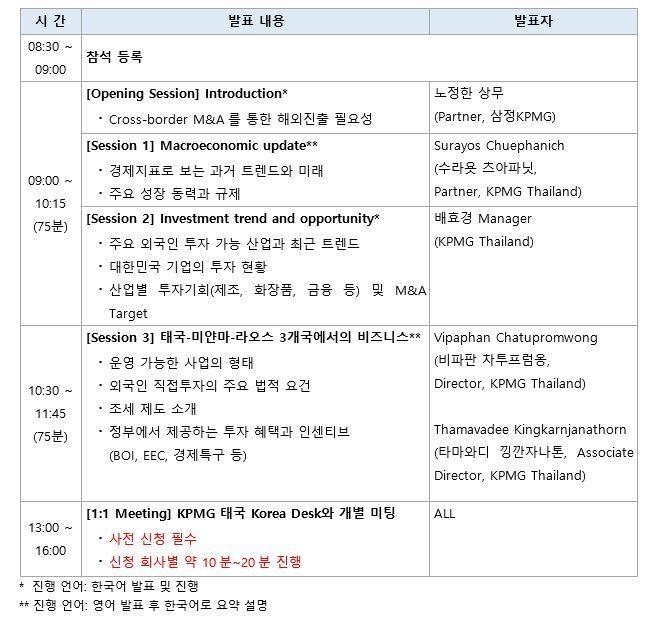 사전 신청 기업은 강연 후 KPMG 태국 코리아 데스크와 1:1 개별 미팅을 받을 수 있다.