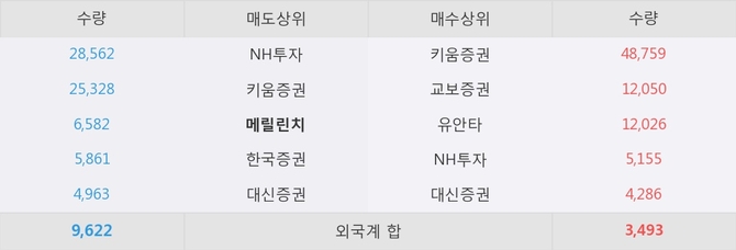 이 시각 주요 거래원은 NH투자, 키움증권, 교보증권 등이 매수 상위 창구에 자리하고 있다. 한편, 매도 창구 상위에는 메릴린치가 눈에 띄고 있다.