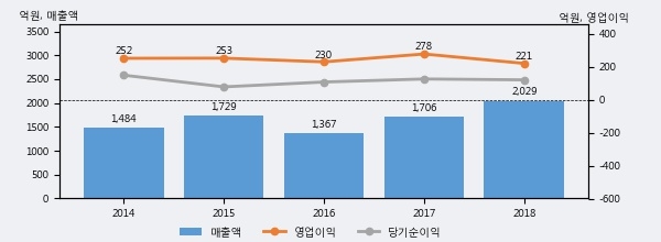 최근 실적을 살펴보면 2018년 매출액이 최근 5년 중 가장 높은 실적을 기록했음을 알 수 있다. 이전 최고 실적이었던 2015년 보다도 17.4%(300억 5천만원) 늘어난 것으로 나타났다.