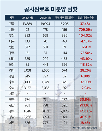 4일 부동산 큐레이션 서비스를 제공하는 경제만랩이 국토교통부 '미분양주택현황보고'를 분석한 결과, 지난해 7월 전국 준공 후 미분양 물량은 1만3889가구 수준이었지만, 올해 7월 1만9094가구로 지난해와 비교해 약 37% 가량 상승한 것으로 나타났다.