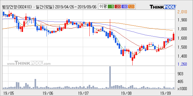 범양건영은 2018년 매출액 1556억원과 영업이익 68억원을 기록했다. 전년대비 매출은 13.7%, 영업이익은 159.9% 각각 상승했다. 이 회사의 매출액 증감률과 영업이익 증감률은 각각 코스피 상위 20%, 상위 8%에 해당된다.