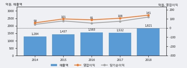 최근 실적을 살펴보면 2018년 매출액이 최근 5년 중 가장 높은 실적을 기록했음을 알 수 있다. 이전 최고 실적이었던 2016년 보다도 16.5%(257억 7천만원) 늘어난 것으로 나타났다.