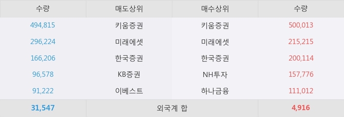 이 시각 주요 거래원은 미래에셋, 키움증권, 한국증권 등이 매도 상위 창구에 자리하고 있다.