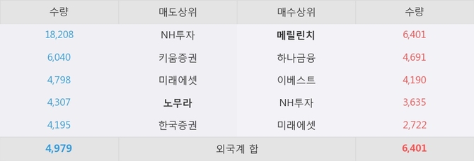 거래원 동향은 메릴린치, 하나금융, NH투자 등이 매수 상위 목록에 나타나고 있다. 한편, 매도 창구 상위에는 노무라가 눈에 띄고 있다.