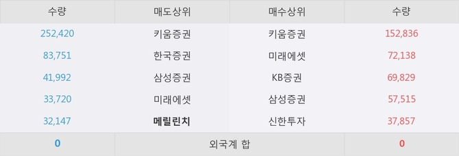 거래원 동향은 미래에셋, 삼성증권 등이 매수 상위 목록에 나타나고 있다. 한편, 매도 창구 상위에는 메릴린치가 눈에 띄고 있다.