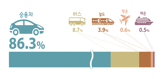 추석 연휴 교통수단은 승용차가 86.3%로 가장 많고 버스 8.7%, 철도 3.9%, 항공기와 여객선이 각각 0.6%, 0.5% 등으로 나타났다.