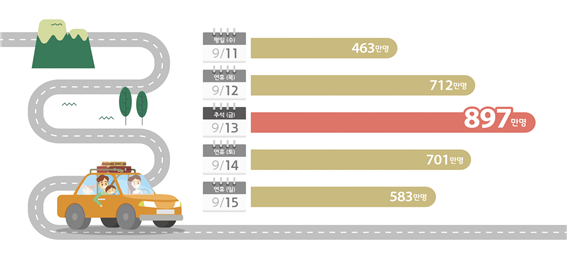 한국교통연구원의 설문조사 결과 추석 연휴 특별교통대책기간 동안 총 3356만명, 하루 평균 671만 명이 이동할 것으로 예상되며, 고속도로를 이용하는 차량대수는 1일 평균 512만 대로 예측된다.