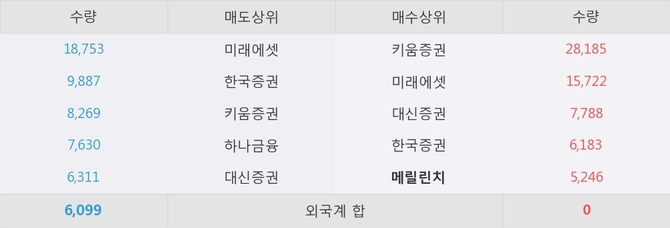 거래원 동향은 메릴린치, 미래에셋이 매수 상위 목록에 나타나고 있다.
