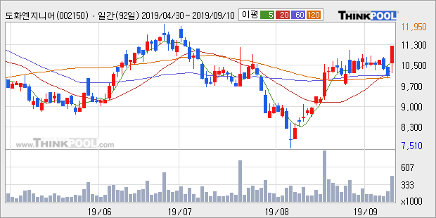 차트상 주가의 흐름은 현재 단기·중기 이평선이 정배열 상태로 전형적인 상승세를 보이고 있다. 최근 이 종목의 차트에서 삼선전환도(양전환), 주가 5MA 상향돌파, 최근 60일 매물대 돌파 등의 특이사항이 발생했다.