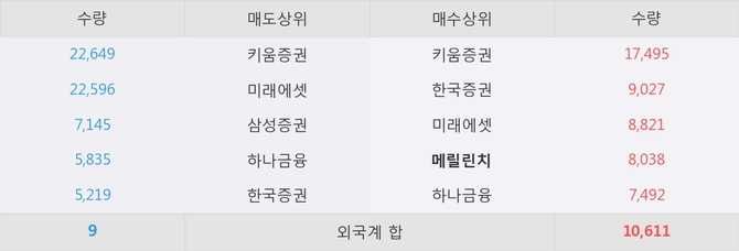 거래원 동향은 메릴린치, 미래에셋, 하나금융 등이 매수 상위 목록에 나타나고 있다.