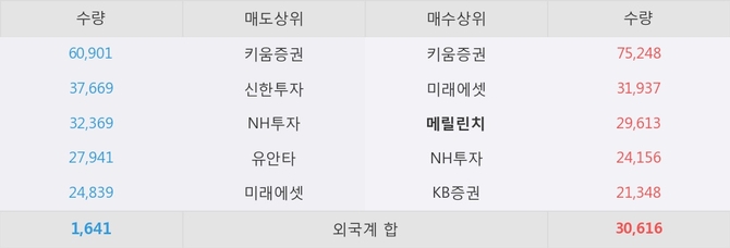 거래원 동향은 메릴린치, 미래에셋, NH투자 등이 매수 상위 목록에 나타나고 있다.