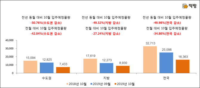 부동산정보서비스 직방에 따르면 10월 전국 아파트 입주 예정 물량은 1만6363가구로 지난해 같은 기간 물량(3만2713가구)보다 49.9% 감소하는 것으로 집계됐다. 같은 기간 동안 수도권은 50.7% 감소한 7433가구, 지방은 49.3% 감소한 8930가구가 입주할 예정이다.