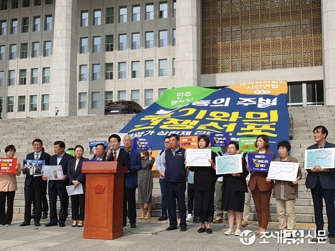 정동영 민주평화당 대표가 1일 오전 서울 여의도 국회 본청 앞에서 열린 민주평화당·경제정희실천시민연합(경실련) 공동기자회견 '불평등의 주범-투기와의 전쟁선포'에서 이 같이 주장했다.