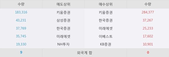 이 시각 주요 거래원은 미래에셋, 키움증권, 한국증권 등이 매수 상위 창구에 자리하고 있다.