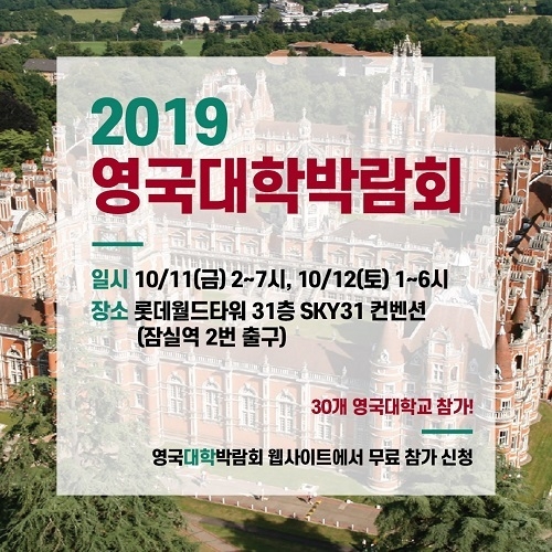 (조세금융신문=김명우 기자) 어학연수 기관 없이 영국 대학교만 참가하는 2019 영국대학박람회가 오는 11~12일까지 롯데월드타워 SKY31 컨벤션에서 열린다. 해당 박람회에는 2020년 QS 세계대학순위 200위 안에 포함되는 영국 명문 대학교들이 대거 참석한다.