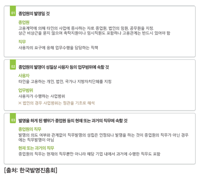 발명진흥법 제2조 제2호은 직무발명을 다음과 같이 정의하고 있다. 직무발명이란 (1) 종업원, 법인의 임원 또는 공무원이 그 직무에 관하여 발명한 것이 (2) 성질상 사용자·법인 또는 국가나 지방자치단체의 업무범위에 속하고 (3) 그 발명을 하게 된 행위가 종업원 등의 현재 또는 과거의 직무에 속하는 발명이다. 직무발명이 성립하기 위해서는 상기의 요건을 검토해보면 된다.