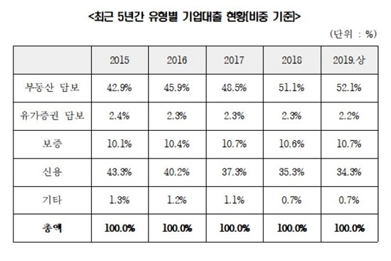 국내 은행들의 올해 6월말 기준 기업대출 잔액은 총 900조5000억 원으로 최근 5년 사이에 기업대출 중 부동산담보대출 비중은 10%포인트 가량 증가한 것인데, 같은 기업 대상 신용대출 비중은 급격히 떨어졌다.