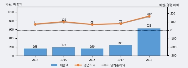 최근 실적을 살펴보면 2018년 매출액이 최근 5년 중 가장 높은 실적을 기록했음을 알 수 있다. 이전 최고 실적이었던 2017년 보다도 157.8%(380억 1천만원) 늘어난 것으로 나타났다.
