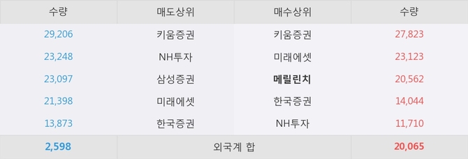 거래원 동향은 메릴린치, 미래에셋, NH투자 등이 매수 상위 목록에 나타나고 있다.