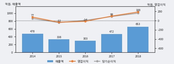 최근 실적을 살펴보면 2018년 매출액이 최근 5년 중 가장 높은 실적을 기록했음을 알 수 있다. 이전 최고 실적이었던 2014년 보다도 36.5%(174억 4천만원) 늘어난 것으로 나타났다.