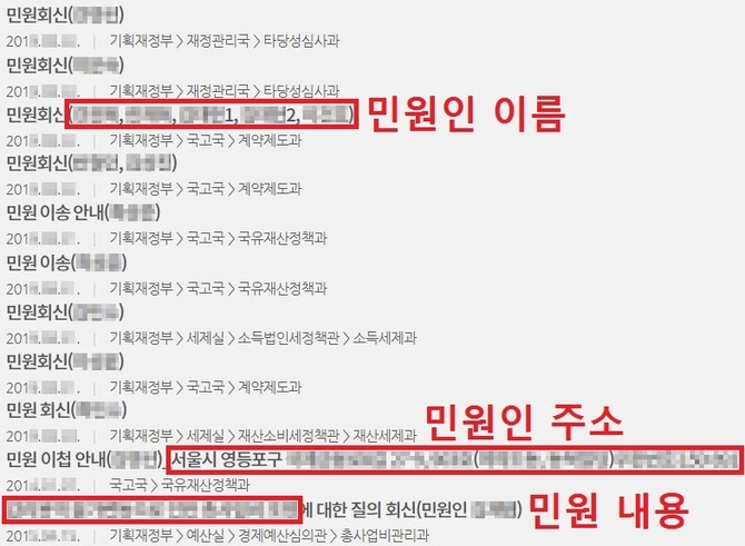 (조세금융신문=고승주 기자) 기획재정부가 민원을 낸 수천 명의 이름을 홈페이지에 그대로 노출했던 것으로 나타났다. 심지어 주소마저 노출된 경우도 있었다.
