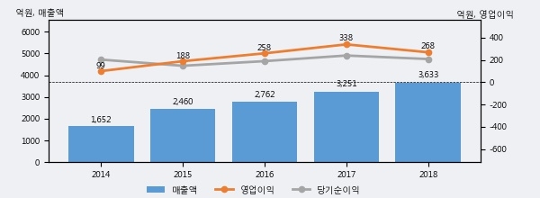 최근 3년간의 실적을 살펴보면 안정적 성장세를 보이고 있다. 최근 3년간 매출로 볼 때 매년 꾸준히 증가하고 있다. 다만 최근에 그 증가폭이 다소 감소하고 있다.