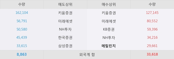 거래원 동향은 메릴린치, 미래에셋, NH투자 등이 매수 상위 목록에 나타나고 있다.