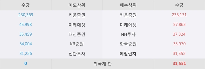 거래원 동향은 메릴린치, 미래에셋, NH투자 등이 매수 상위 목록에 나타나고 있다.