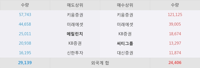거래원 동향은 씨티그룹, 미래에셋이 매수 상위 목록에 나타나고 있다. 한편, 매도 창구 상위에는 메릴린치가 눈에 띄고 있다.