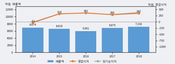 최근 실적을 살펴보면 2018년 매출액이 최근 5년 중 가장 높은 실적을 기록했음을 알 수 있다. 이전 최고 실적이었던 2014년 보다도 2.6%(182억 1천만원) 늘어난 것으로 나타났다.