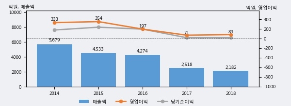 최근 3년간의 실적을 살펴보면, 매출액은 3년 연속 하락하고 있으나 그 하락폭은 줄어들고 있음을 알 수 있다.
