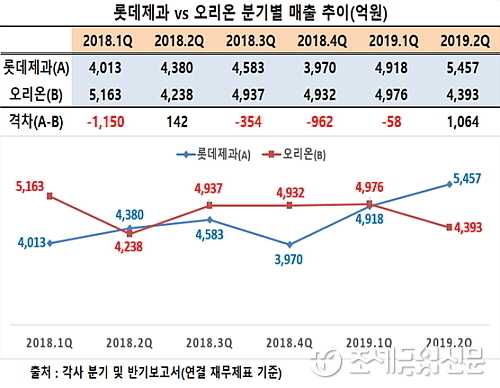 실제로 국내사업(별도재무제표 기준)의 경우 롯데제과의 올 상반기 매출은 7693억 원으로 오리온의 3558억 보다 약 2.16배 더 많다.