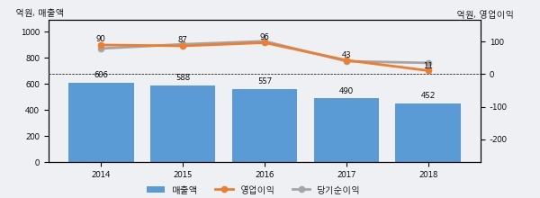 최근 3년간의 실적을 살펴보면, 매출액은 3년 연속 하락하고 있으나 그 하락폭은 줄어들고 있음을 알 수 있다.