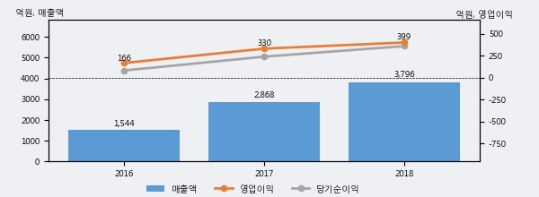 최근 실적을 살펴보면 2018년 매출액이 최근 3년 중 가장 높은 실적을 기록했음을 알 수 있다. 이전 최고 실적이었던 2017년 보다도 32.4%(928억 2천만원) 늘어난 것으로 나타났다.