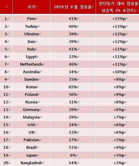 시장조사업체 카운터포인트 리서치에 따르면 갤럭시노트10이 출시된 8월 삼성전자는 조사 대상 국가 90여개국 중 60여개국에서 전년 대비 점유율이 상승한 것으로 나타났다.