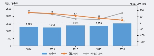 최근 실적을 살펴보면 2018년 매출액이 최근 5년 중 가장 높은 실적을 기록했음을 알 수 있다. 이전 최고 실적이었던 2016년 보다도 9.1%(125억 8천만원) 늘어난 것으로 나타났다.