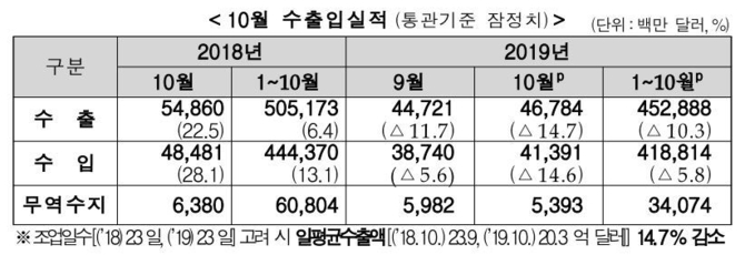 무역수지는 54억 달러 흑자로 93개월 연속 흑자를 기록했지만 2018년 10월 무역수지(64억 달러)와 비교해 약 15% 감소한 수준이다.