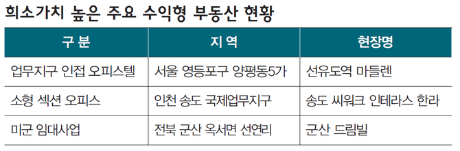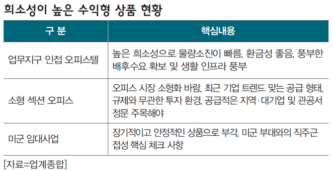 대표적인 희소성이 높은 수익형 상품으로 업무지구 인접 오피스텔, 소형 섹션 오피스, 미군 임대사업 등이 있다.