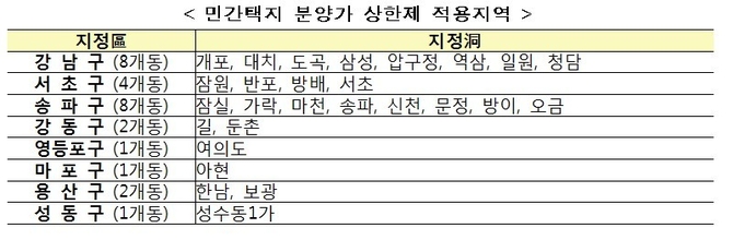 국토부 관계자는 “최근 분양가격 상승률이 높고, 집값 상승세가 지속되고 있어 시장 영향력이 큰 서울을 중시으로 지정 요건 충족 지역을 구 단위로 먼저 선별했다”라며 “해당 구내의 정비사업·일반사업 추진 현황, 최근 집값 상승률, 고분양가 책정 우려 등 시장 영향력 등을 종합적으로 고려해 동(洞) 단위로 핀셋 지정했다”고 설명했다.