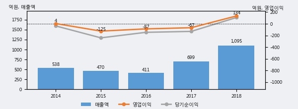 최근 실적을 살펴보면 2018년 매출액이 최근 5년 중 가장 높은 실적을 기록했음을 알 수 있다. 이전 최고 실적이었던 2017년 보다도 56.7%(396억 1천만원) 늘어난 것으로 나타났다.