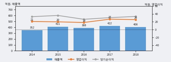 티비씨의 2018년 매출액은 전년대비 -3.8% 줄어든 406억원이고, 영업이익 역시 전년대비 -4.1% 줄어든 26억원을 기록했다. 이 회사의 매출액 증감률과 영업이익 증감률은 각각 코스닥 하위 33%, 상위 48%에 해당된다.