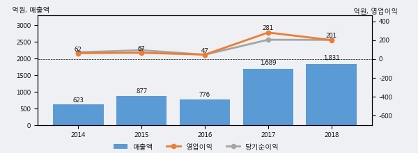 최근 실적을 살펴보면 2018년 매출액이 최근 5년 중 가장 높은 실적을 기록했음을 알 수 있다. 이전 최고 실적이었던 2017년 보다도 8.4%(142억원) 늘어난 것으로 나타났다.