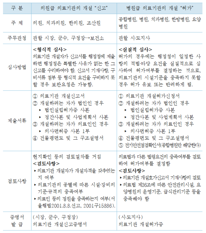 3. 의원급 의료기관과 병원급 의료기관의 개설 “신고”와 개설 “허가” 비교