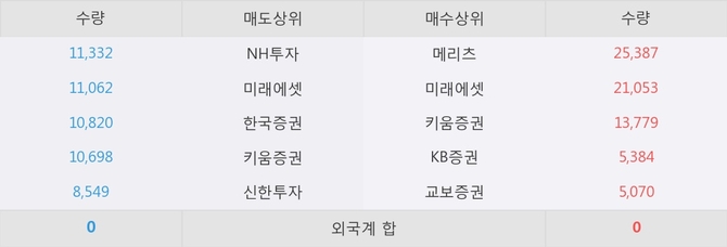 거래원 동향은 메리츠, 미래에셋 등이 매수 상위 목록에 나타나고 있다.