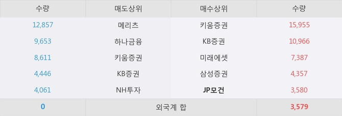 거래원 동향은 메리츠, 하나금융, NH투자 등이 매도 상위 목록에 나타나고 있다. 한편, 매수 창구 상위에는 JP모건이 눈에 띄고 있다.