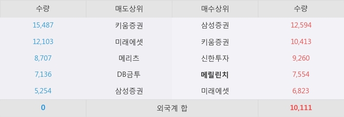 거래원 동향은 메릴린치, 삼성증권, 미래에셋 등이 매수 상위 목록에 나타나고 있다.