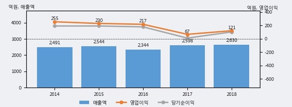 최근 실적을 살펴보면 2018년 매출액이 최근 5년 중 가장 높은 실적을 기록했음을 알 수 있다. 이전 최고 실적이었던 2017년 보다도 1.2%(31억 7천만원) 늘어난 것으로 나타났다.