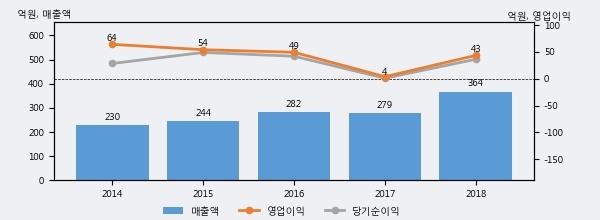 최근 실적을 살펴보면 2018년 매출액이 최근 5년 중 가장 높은 실적을 기록했음을 알 수 있다. 이전 최고 실적이었던 2016년 보다도 29.0%(81억 9천만원) 늘어난 것으로 나타났다.